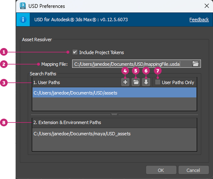 This dialog lets you manage how USD resolves asset paths in 3ds Max. It defines where and how the resolver searches for assets, including project tokens, user-defined paths, and environment variables.
