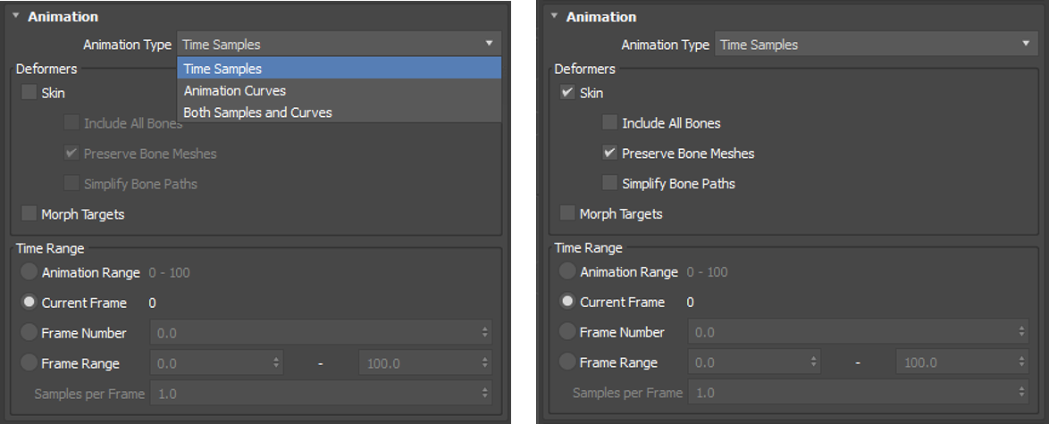 Animation Type: Specifies the type of animation to be exported. Options include Time Samples, Animation Curves or Both Samples and Curves. Currently the Animation Curves option supports the following attributes: