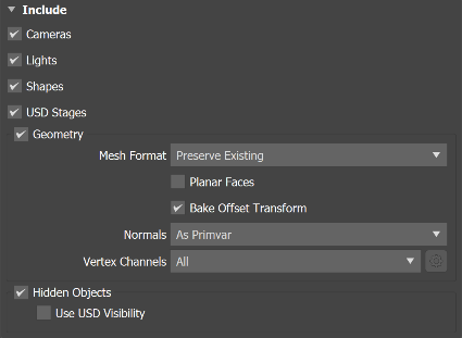 Cameras: When on, cameras are exported. Standard (physical, free and target cameras), 2 types of Vray cameras, and 4 types of Arnold cameras can export directly to USD format.
