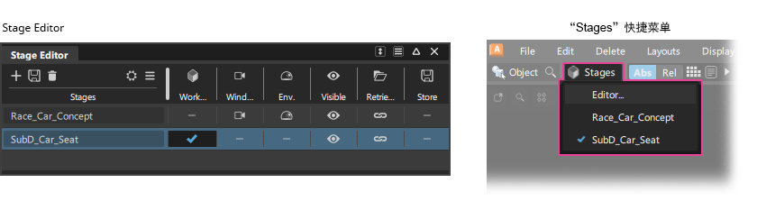 “Stage Editor”工具显示在编辑器中列出的每个后台文件所在的列中。