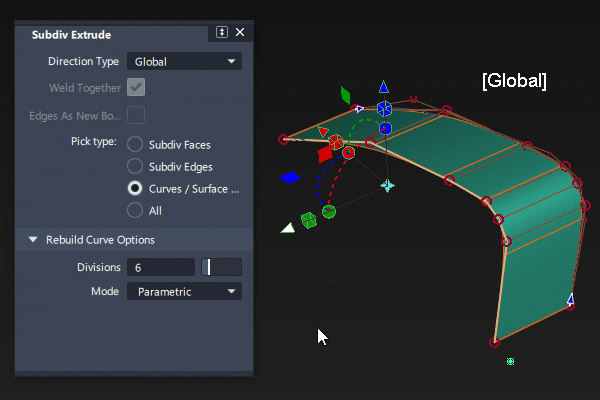 设置“Rebuild Curve Options”:包括设置要沿拉伸曲线添加的 CV 数 (Divisions)、设置跨距的分布方式 (Mode) 以及调整源曲线或边曲率对 CV 间距的影响 (Curvature Bias)。
