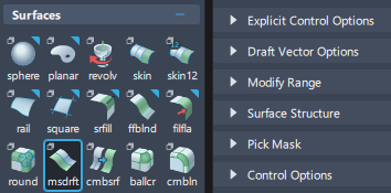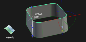 要沿某个方向(而不是沿曲线)拉伸曲面,请使用“MS Draft”工具。选项可用于添加成型拔模角度或添加拱形状。“Extrude”工具使用曲线表示拉伸方向和形状。