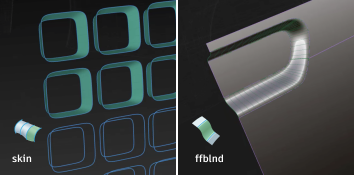“Skin”可在两条曲线之间构建直线曲面,或在多条曲线之间构建过渡曲面。“Freeform Blend”执行相同的操作,并增加了对连续性的控制。