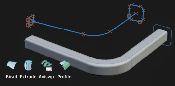 “Profile”工具允许曲线和形状的组合,并增加了对方向的控制。“Extrude”和“Rail”工具可用于简单扫掠。