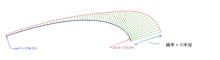 “Curvature”值是任意一个点处半径的倒数 (C=1/R)。此计算以图形方式显示在曲线上的离散点处。