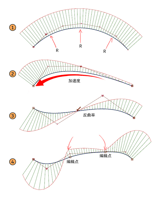 曲率梳图由沿曲线从起点到终点查看时线长度的变化来解释。