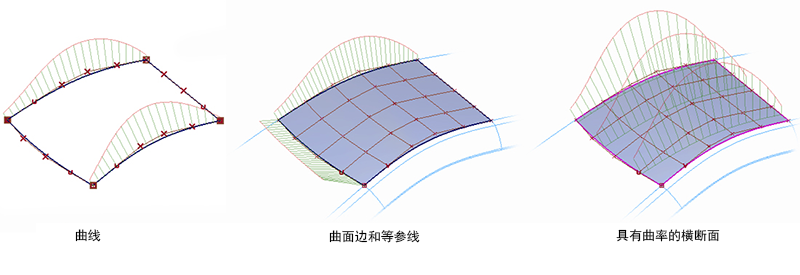 在下图中,将曲线曲率和曲面曲率(主最大值)应用于曲面:
