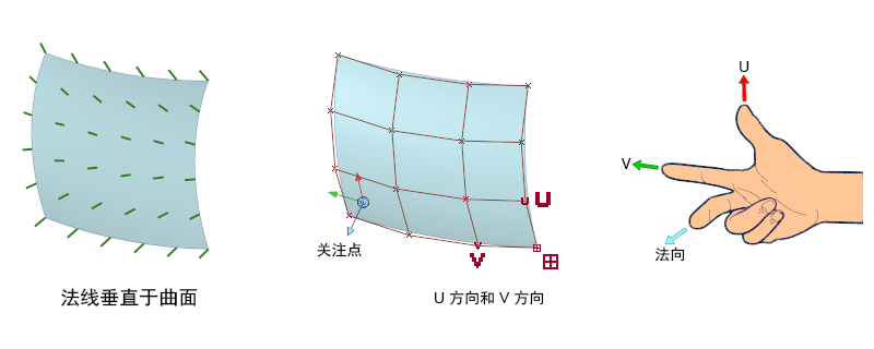 根据右手规则,几何法线的方向由曲面上 U 和 V 外壳线的方向确定。