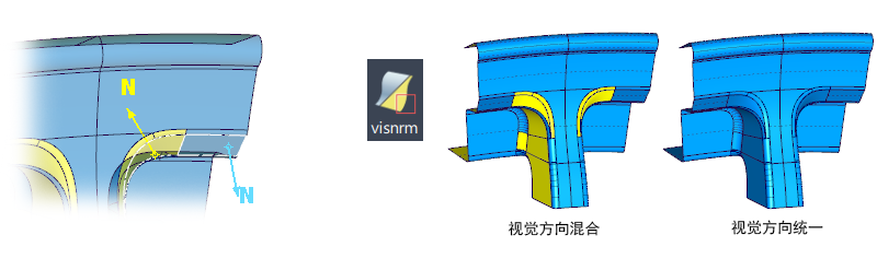 可视曲面方向也称为黄色法线,因为使用 Set Visual Surface Orientation 工具显示和更改它时使用该颜色。