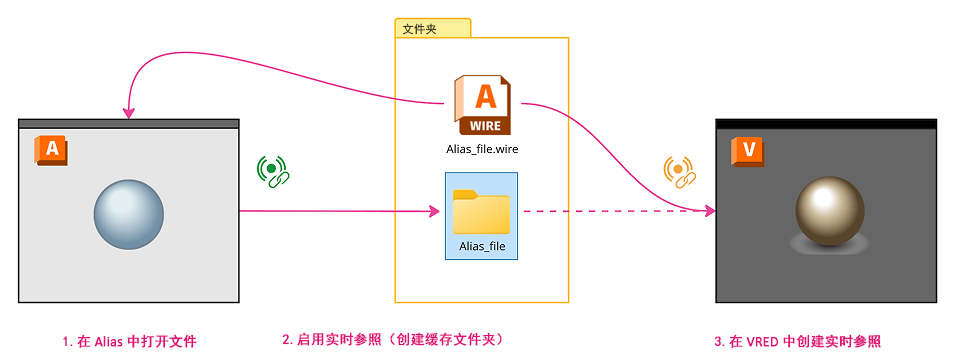 在 Alias 中,实时参照从当前加载的 .wire 文件开始。为文件启用该功能将生成数据的临时缓存 (.alvred) 版本,并使其可供 VRED 使用。在 VRED 中,创建实时参照,从而建立与缓存的实时连接。现在,您的数据在两个应用程序中看起来相同,无需进行其他修改。这样,Alias 建模师就可以将数据实时发送给 VRED 可视化专家。