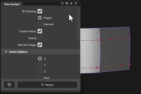 现在,无需退出“Trim Surface”工具,即可编辑包括删除或替换面上线的修剪后台文件。只需按住 Ctrl 键并选择现有的面上线。要删除曲线,请在视口中选择“Delete COS”或按空格键。
