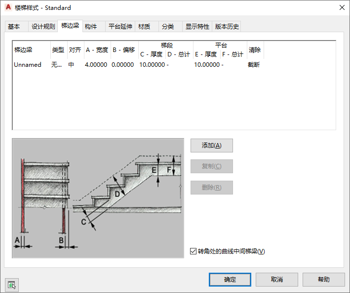 当“转角处的曲线中间梯梁”选项处于清除状态时,中间梯边梁将进行斜接,以便与平台转角的角度相匹配。在多数情况下,这将是一个直角,但任何其他角度也是可行的。
