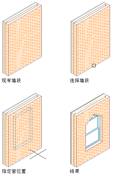 | 墙中的窗 | 选择墙,然后沿墙指定插入点。 |