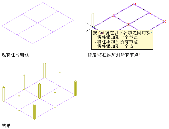 | 将柱添加到栅格中所有节点 | 按 Ctrl 键,然后单击鼠标。 |