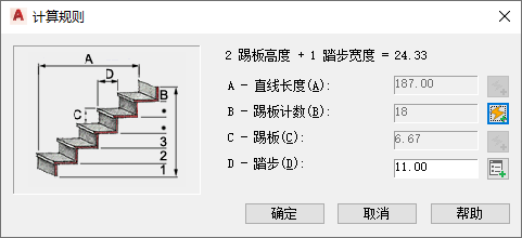 | 指定楼梯踢板的总数 | 在“踢板计数”中输入值。