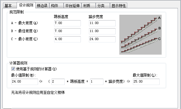 使用以下步骤,可以为踢板高度和踏步宽度指定最小、最大与最佳规范限制,还可以指定楼梯的计算规则。