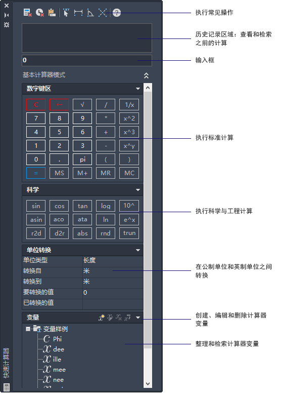 除了在科学计算器中的基本功能以外,“快速计算器” 计算器还包括几何函数、单位转换和变量。
