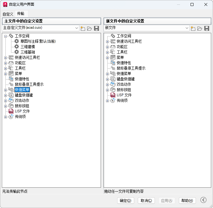 在命令提示下输入 CUIIMPORT 后,右侧窗格中将显示主 CUIx 文件(默认情况下,AutoCAD 文件将显示为 acad.cuix,AutoCAD LT 文件将显示为 acadlt.cuix)。可在左侧窗格中打开 CUIx 或传统项自定义文件以传输数据。在命令提示下输入 CUIEXPORT 后,左侧窗格中将显示主 CUIx 文件。可在右侧窗格中打开另一个 CUIx 文件或传统项自定义文件以传输数据。