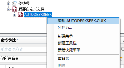 在要卸载的局部 CUIx 文件上单击鼠标右键。依次单击“卸载”