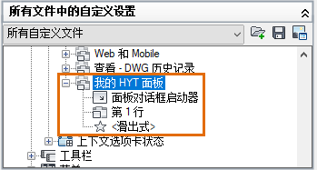 - 在 CUI 编辑器中,找到新创建的功能区面板(“我的 HYT 面板”)(如果需要)。