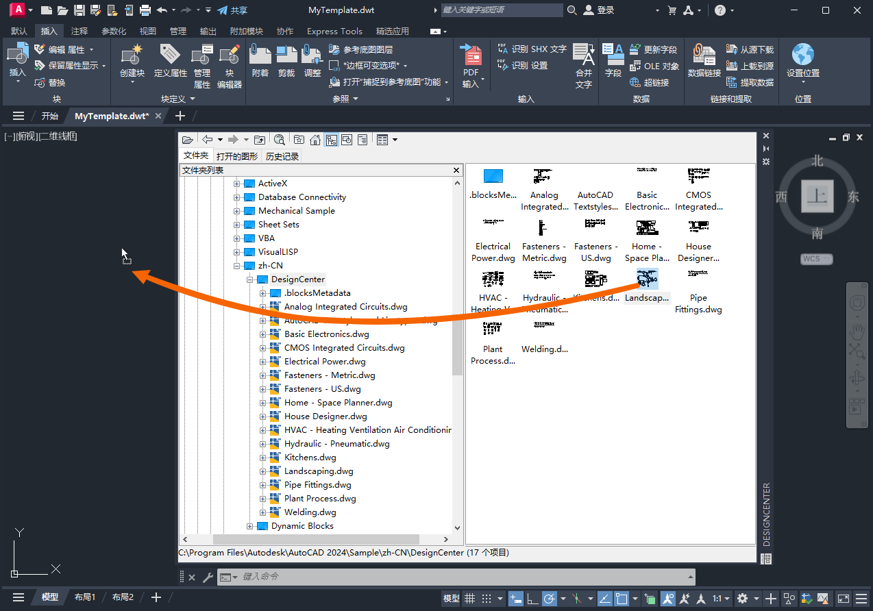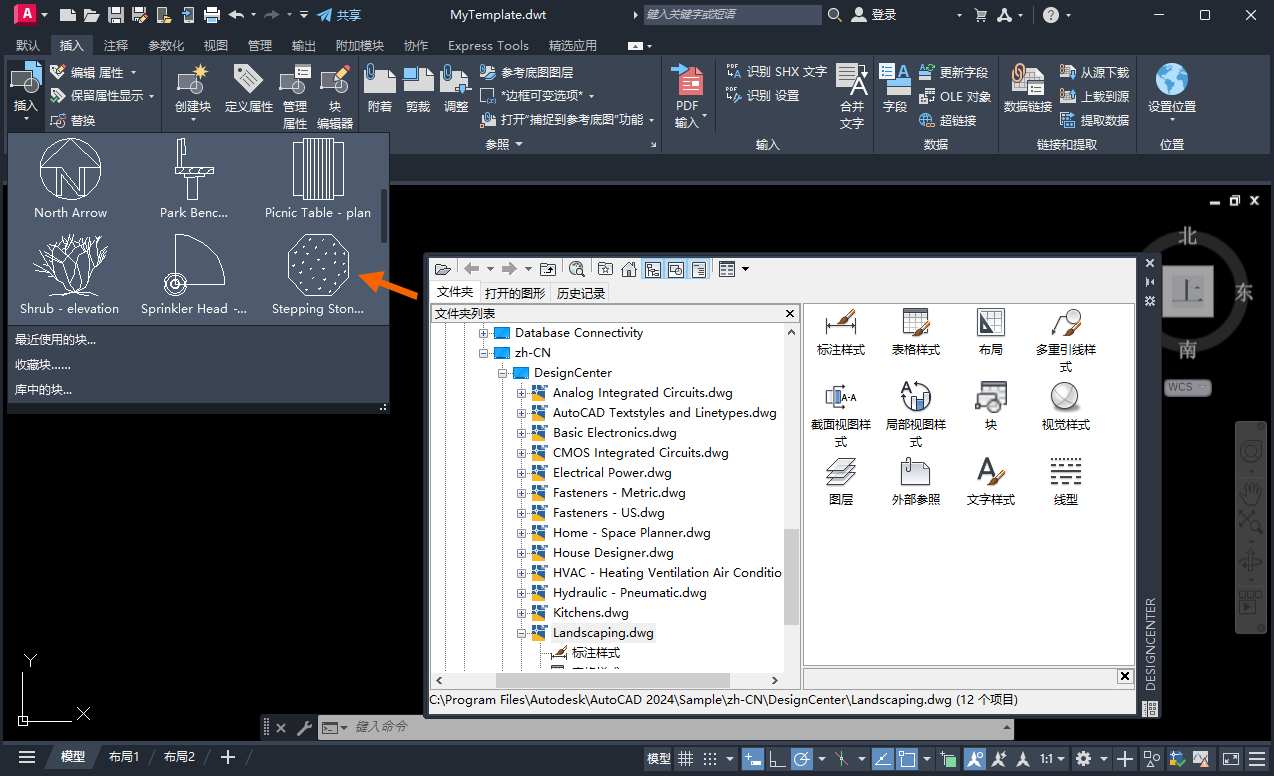 现在,在“Landscaping.dwg”中定义的命名样式、块和图形设置在“MyTemplate”中立即可用。