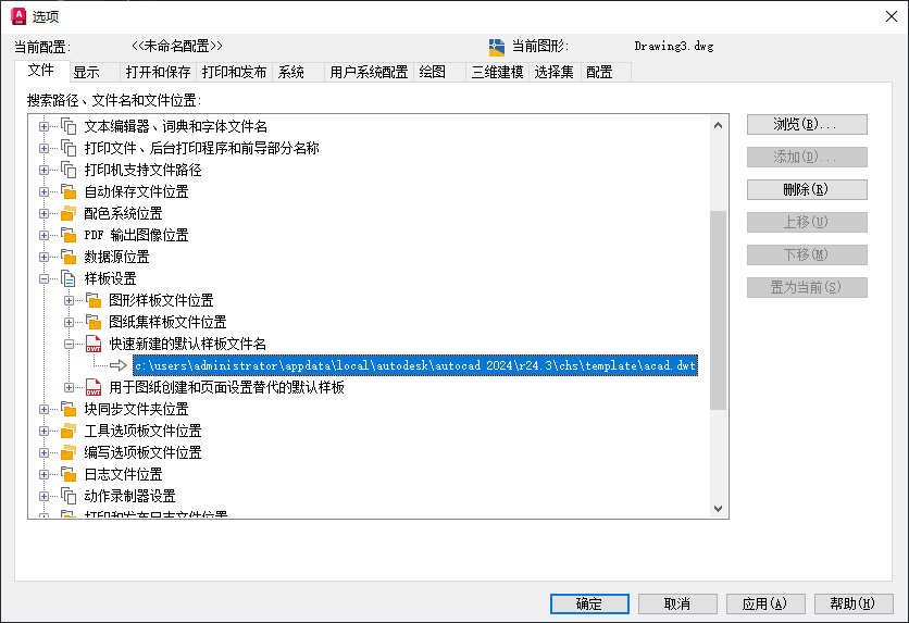 现在,已创建并保存了样板,即可开始使用它。默认情况下,开始绘制新图形时,AutoCAD 将根据在“QNEW 的默认样板文件名”(在此例中为“acad.dwt”)中指定的样板创建图形。让我们更改此设置,以使用新样板开始绘制新图形。