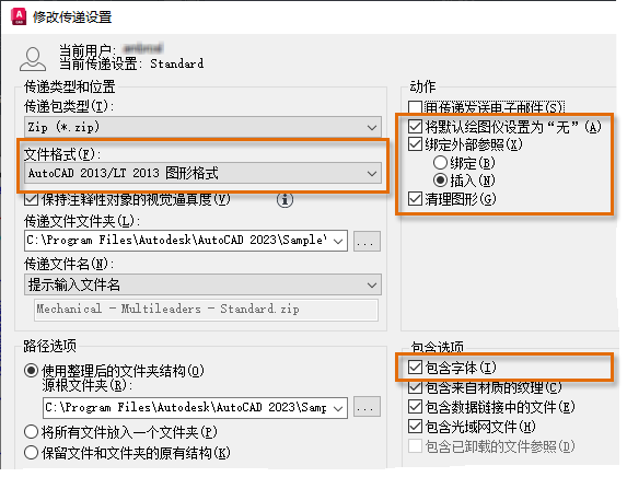 - 在“传递类型和位置”下,单击“文件格式”下拉列表,然后选择“AutoCAD 2013/LT 2013 图形格式”。