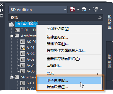 如果当前图形是图纸集的一部分,则图纸集数据 (DST) 及其支持文件也包含在传递包中。在图纸集中创建文件的传递包时,建议使用图纸集管理器中的电子传递功能而不是使用 ETRANSMIT 命令。在图纸集管理器中的图纸集节点上单击鼠标右键,然后选择“电子传递”以打包图纸集中的所有图形和支持文件。图纸集还可以包含传递设置,这样可以更轻松地与处理项目的其他用户共享传递设置。