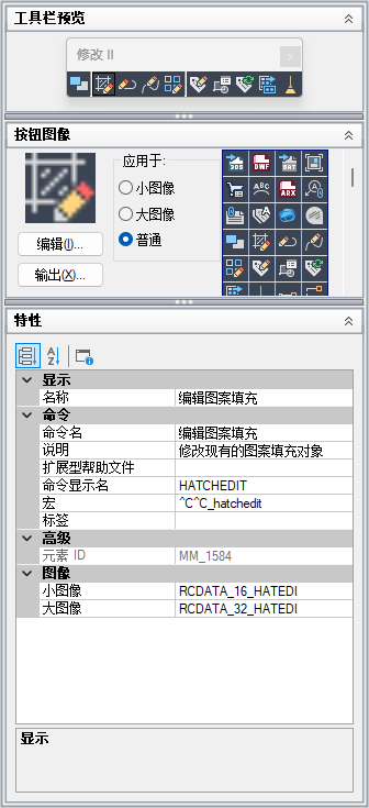 在开始自定义功能区选项卡和面板、快速访问工具栏和其他用户界面元素之前,您应当熟悉自定义用户界面 (CUI) 编辑器(可以使用 CUI 命令打开它)。“自定义”选项卡在默认情况下显示并分为三个窗格:“...中的自定义设置”、“命令列表”和“动态显示”窗格。