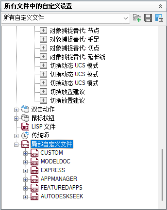 在此窗格中,可以创建和修改用户界面元素(例如功能区选项卡和面板)以及快速访问工具栏。沿着窗格的顶部可以找到一些工具,这些工具可以用于将部分自定义文件加载到主自定义文件、将更改保存到已加载的自定义文件以及控制如何查看已加载的自定义文件。