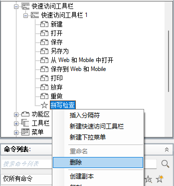 - 在要删除的命令上单击鼠标右键,然后单击“从快速访问工具栏中删除”。