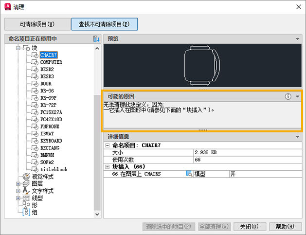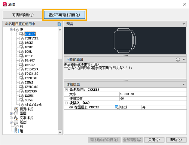 可能有一个项目需要清除,但它不会显示在“未使用的命名项目”列表中。使用“查找不可清除项目”列表,可以查看图形中正在使用的命名项目。