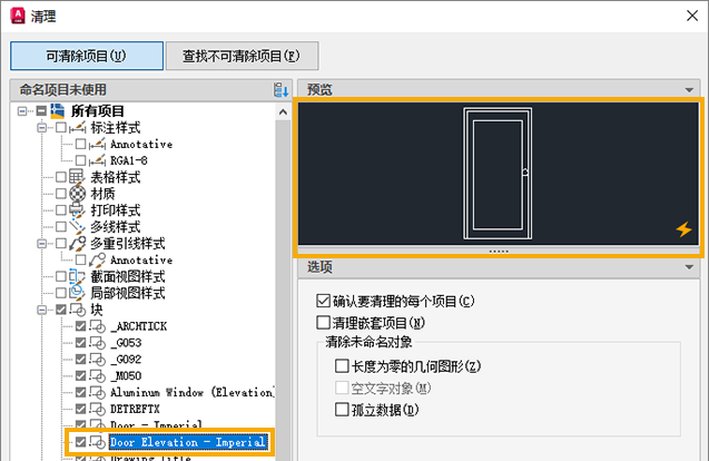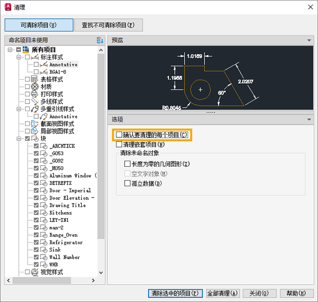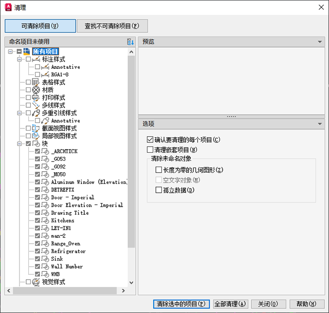 “清除”会删除图形中未使用的项目或命名对象,例如块定义和图层。