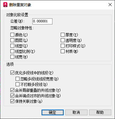 默认情况下,OVERKILL 不会作用于具有差异化特性的对象。例如,如果对象相同但位于不同的图层上或具有不同的线宽,则这些对象将不会被视为重复对象。但是,可以更改设置以忽略某些特性。
