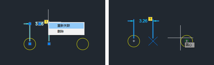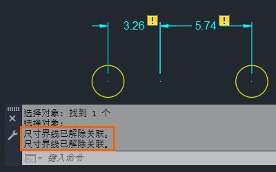标注上将显示黄色标记,指示标注不再与圆相关联。删除中间圆时,创建了两个已解除关联的标注。