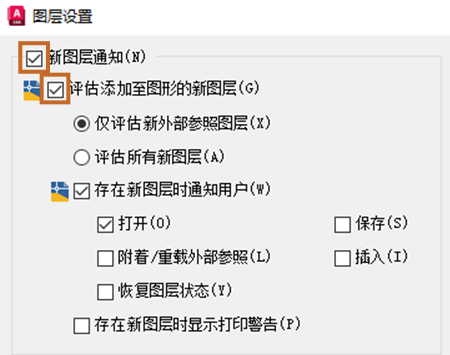 每个选项都指示通知何时显示。因此,如果“打开”处于选中状态并且存在一个新图层,则通知在打开图形时显示。如果“保存”处于选中状态并且有一个新图层,则通知在每次保存时都会显示。