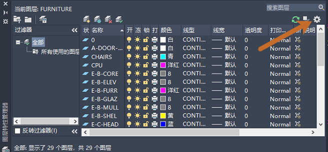 假定您要将“FURNITURE”图层置为当前。当然,只需打开图层列表并滚动,直到找到“FURNITURE”图层。让我们改用“置为当前”来快速更改当前图层。