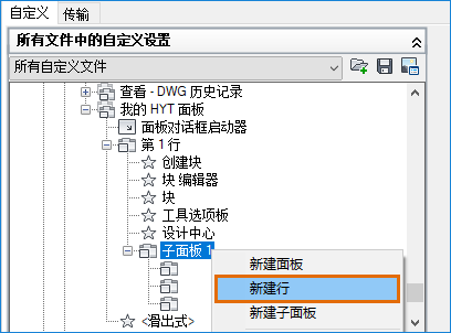 - 在 CUI 编辑器中,找到新创建的功能区面板(“我的 HYT 面板”)(如果需要)。
