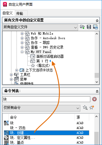 - 在“命令列表”窗格的“搜索命令列表”文本框中,键入“block”。选择“Make Block”(BLOCK 命令),然后将其拖动到“我的 HYT 面板”下的第 1 行。
