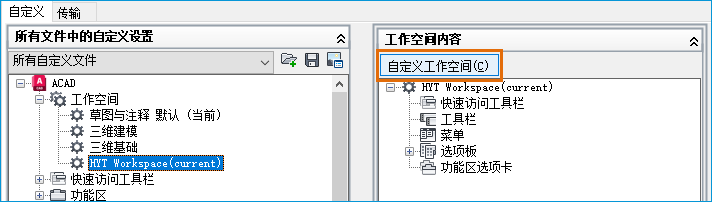 新的功能区选项卡不会自动添加到工作空间中。 以下步骤介绍了如何将“我的 HYT 选项卡”添加到当前工作空间。