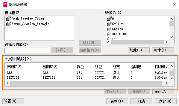 - 在“图层转换映射”部分中,在“旧图层名”列中选择“Struc_Section_Dim”,然后单击“编辑”。