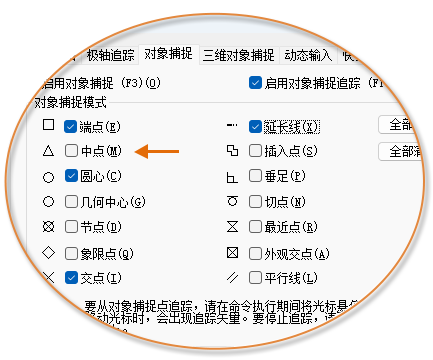 输入 OSNAP 命令以设置默认对象捕捉,也称为“运行”对象捕捉。例如,您可能会发现,默认启用“中点”对象捕捉很有用。