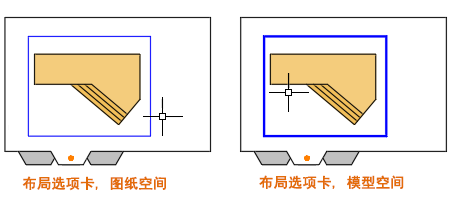 当在布局选项卡上工作时,可以在图纸空间和模型空间之间切换,而无需返回到“模型”选项卡。具体如下所示。如图所示,移动光标,然后双击布局视口内部以访问模型空间,或者在布局视口外部双击以返回到图纸空间。当位于模型空间中时,布局视口的边界会变粗。