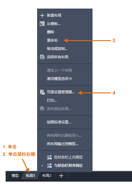 首先,您应在访问布局选项卡 (1) 时,在选项卡 (2) 上单击鼠标右键,然后将该选项卡 (3) 重命名为比“布局 1”更具体的名称。参照特定 ANSI 或 ISO 尺寸的名称可能是一个不错的选择。