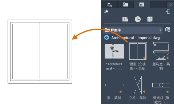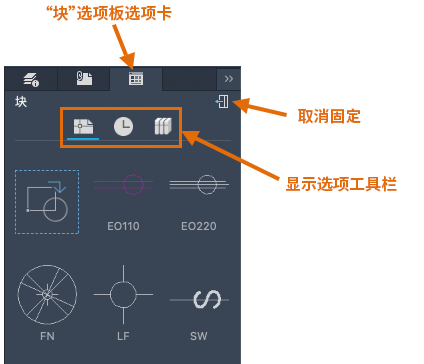 这将打开“块”选项板,并使其处于活动状态。默认情况下,该浏览器固定在应用程序的右侧。