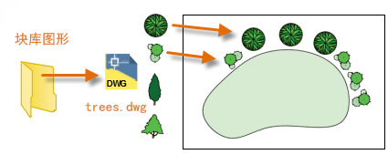 - 图形文件中包含一个或多个块定义。例如,可以创建仅包含树块定义的图形。然后,您可以将该图形中的任何块插入到当前图形中。包含相关块族的图形文件通常称为块库图形。