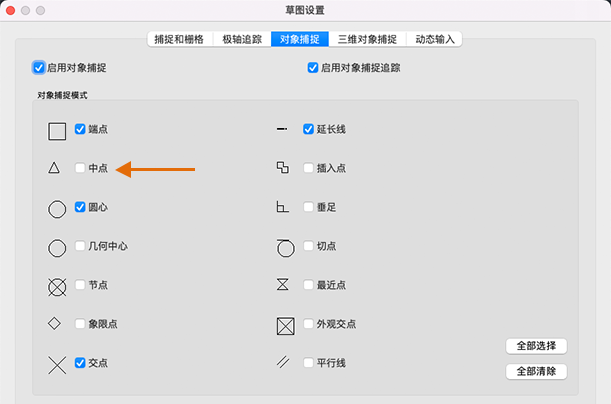 输入 OSNAP 命令以设置默认对象捕捉,也称为“运行”对象捕捉。例如,您可能会发现,默认启用“中点”对象捕捉很有用。