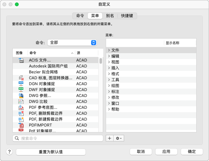 显示让您可以管理菜单中命令和子菜单的菜单。