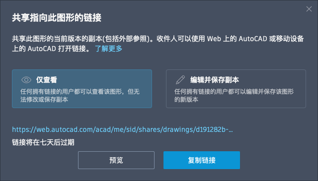 共享指向当前图形副本的链接,以在 AutoCAD Web 应用程序中查看或编辑。图形副本包含所有外部参照和图像。