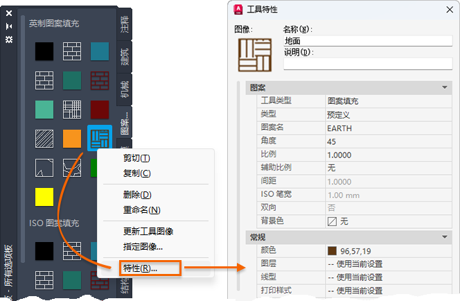 在工具添加到工具选项板后,即可更改其默认特性。例如,可以更改块的插入比例或填充图案的图层。